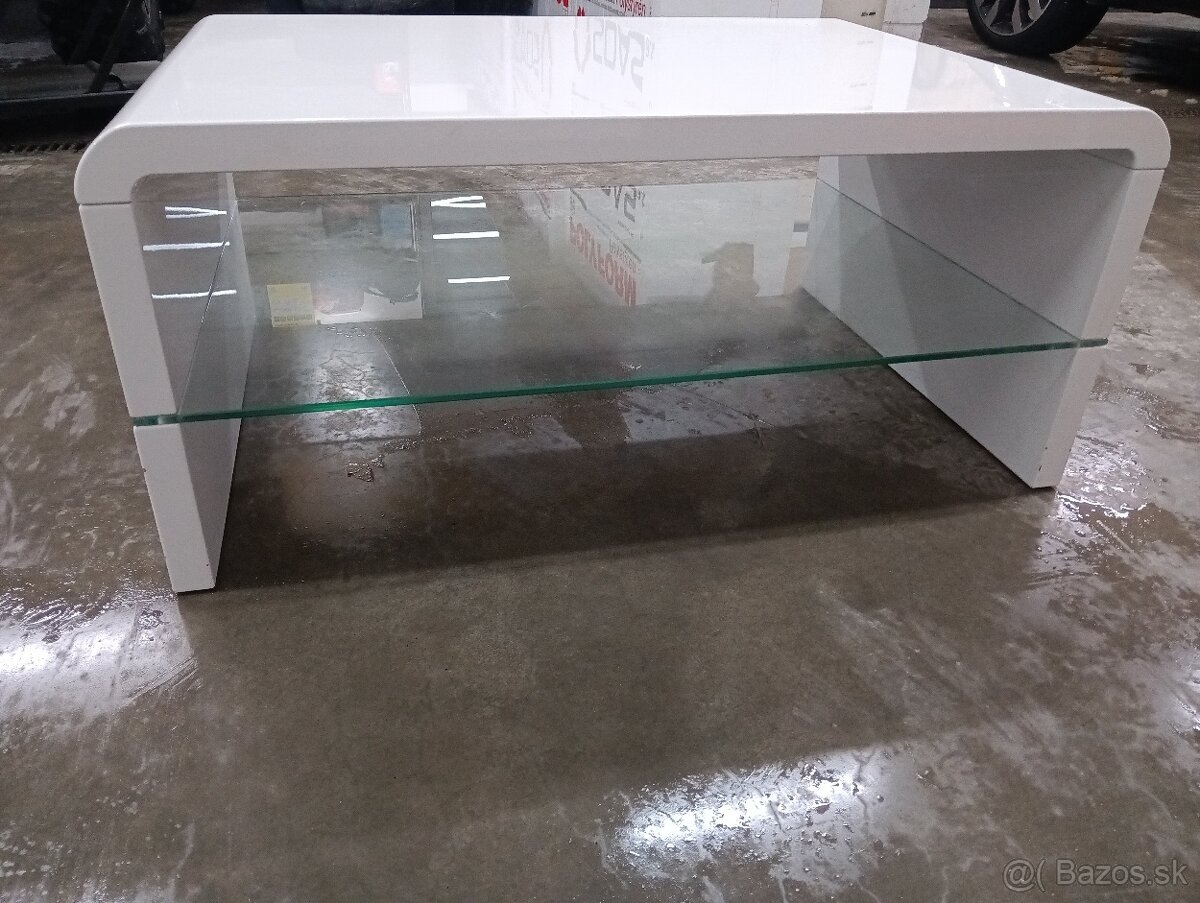 Predám konferenčný stolík, biely lesk, sklenená polička, rozmer 90x60x40cm. Mierne známky používania. Cena 60€.