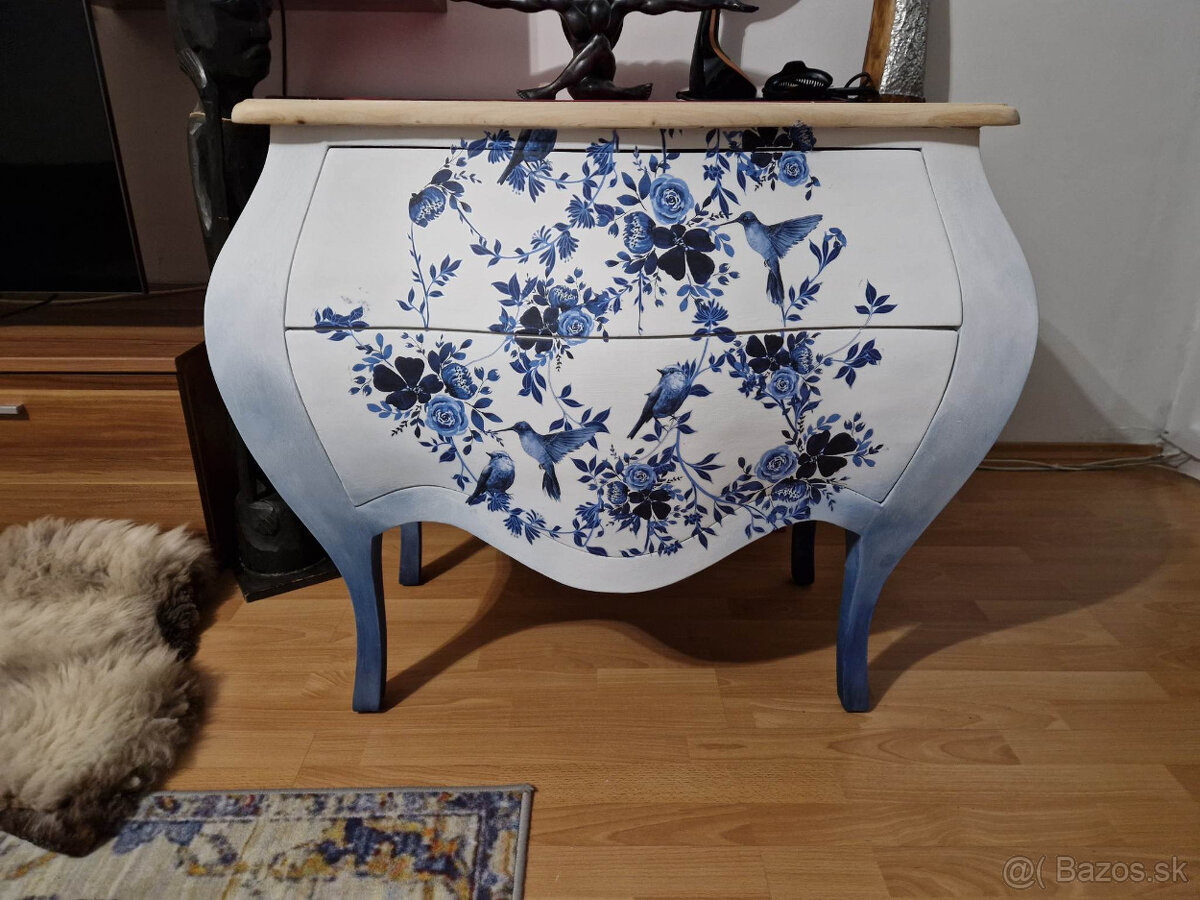 Ponúkam na predaj komodu zaujímavých tvarov. Maľovaná, tónovaná od tmavej modrej cez šedú až k bielej. Vrchná doska v prírodnom prevedení, jemne do biela. Vzor transfer a voskovaná. Úchytky s môjho výberu v cene . Rozmer : 85 x 81 x 40 cm - Š/V/H.