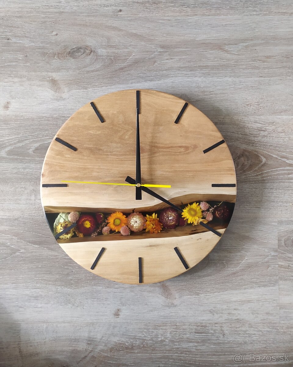 Predam epxidove hodiny orechove drevo zaliate susene kvety priemer 35 strojcek tichy