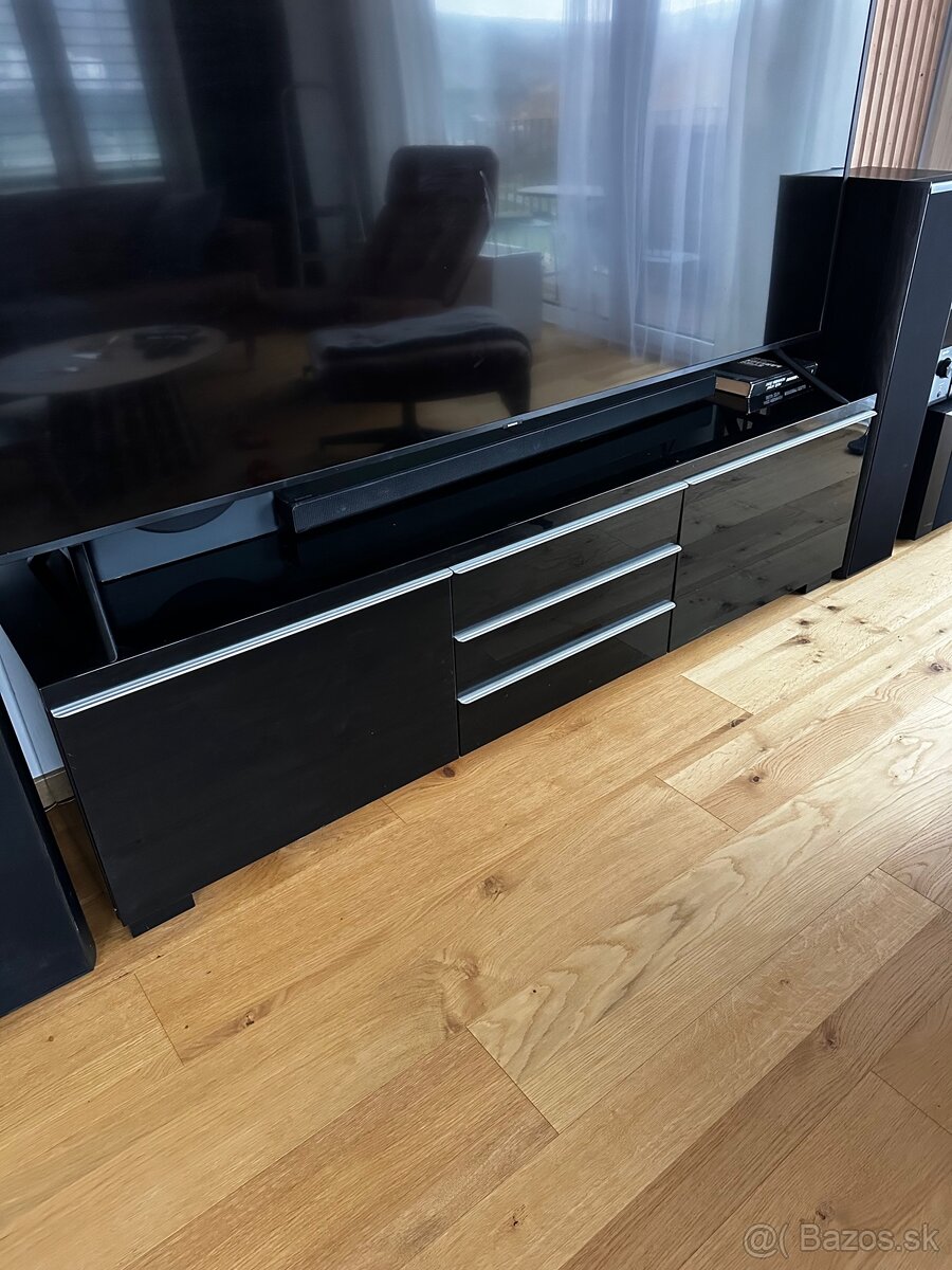 Predáme čiernu lesklú komodu pod TV z IKEA, rozmery 180cm x 49cm výška x 40cm hĺbka, dva výsuvné šuflíky na kolieskach, v strede falošné šuflíky na umiestnenie zariadení na pripojenie k TV.
