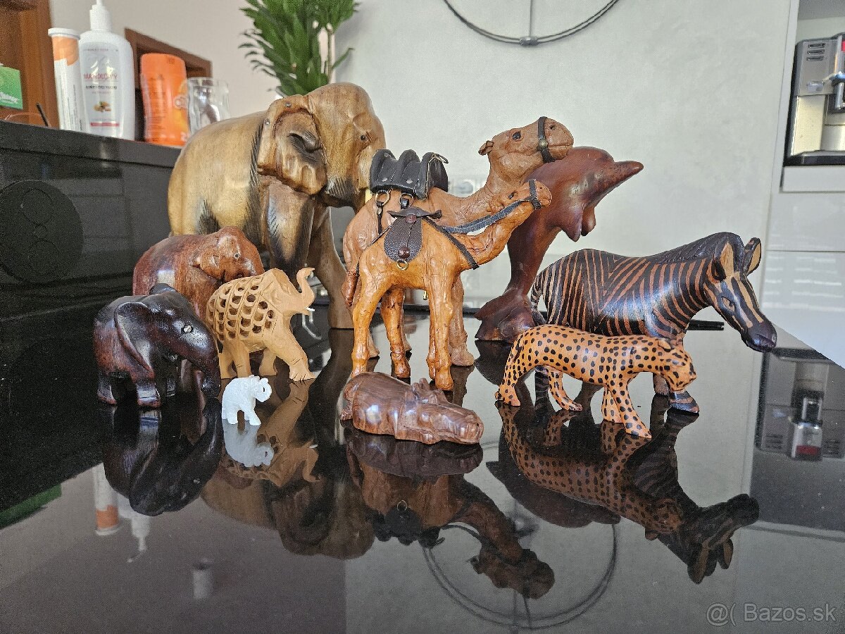 Predám drevené africké zvieratá. Možné vystaviť ako doplnky do interiéru. Slony, ťavy, zebra, hroch... najväčší slon má 23x24cm. Ťavy sú potiahnuté materiálom podobným jemnej koži. Delfín má zlepený podstavec, ten dávam ako doplnok.
