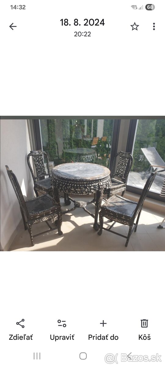 Veľmi starý stôl plus 4 stoličky, 2 treba opraviť, zrkadlo a stolík. Nábytok je zdobený perleť ou, kameňom. Viac ako 120rocny.velmi pekný a zachovalý.