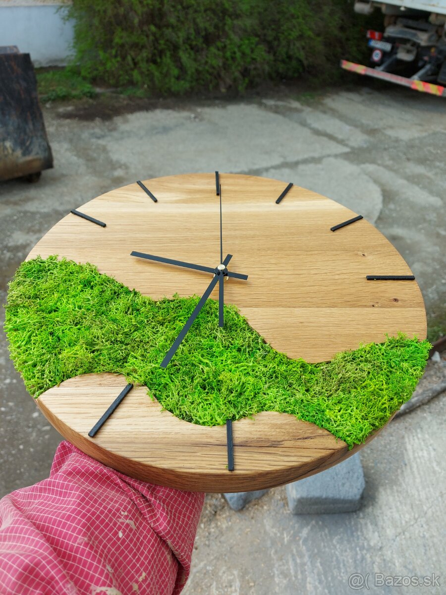 Machové nástenné hosiny z dubového masívu, dreva a stabilizovaného machu. Hodiny majú priemer 38cm a majú drevené čierne paličky na ciferníku. Poháňa ich tichý chod strojčeka.