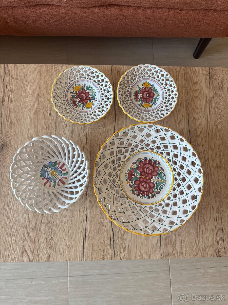 Predám pekný set dierkovaných keramických mís s ručne pôsobiacim folklórnym motívom. Vhodné ako výrazná dekorácia do chalupy, tradične ladenej kuchyne alebo na stenu.