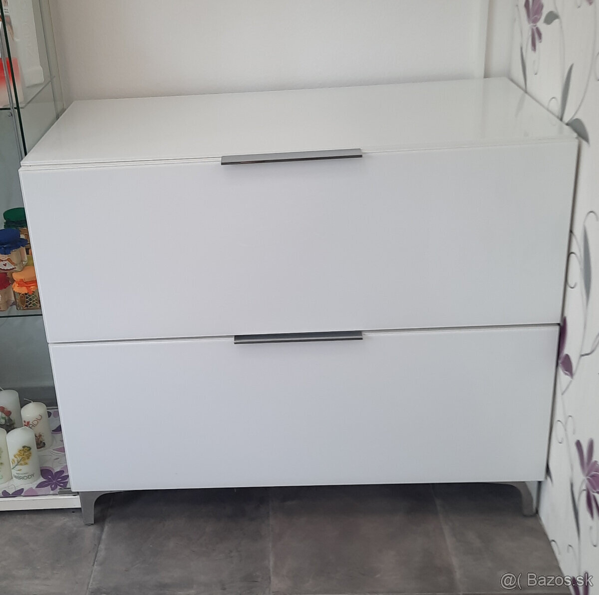 Predám krásnu kvalitnú komodu s 1 dvierkami a 1 šuplík, z dôvodu rušenia prevádzky, používaná cca rok bez poškodenia, ako nová. Materiál zvrchu a spredu sklo. Nožičky kovové. Samozatvárací mechanizmus otvárania dvierok a tlmené dovieranie. Výška 76cm, šírka:90cm, hrúbka 50cm. Pôvodná cena 390 nová cena 200 eur.