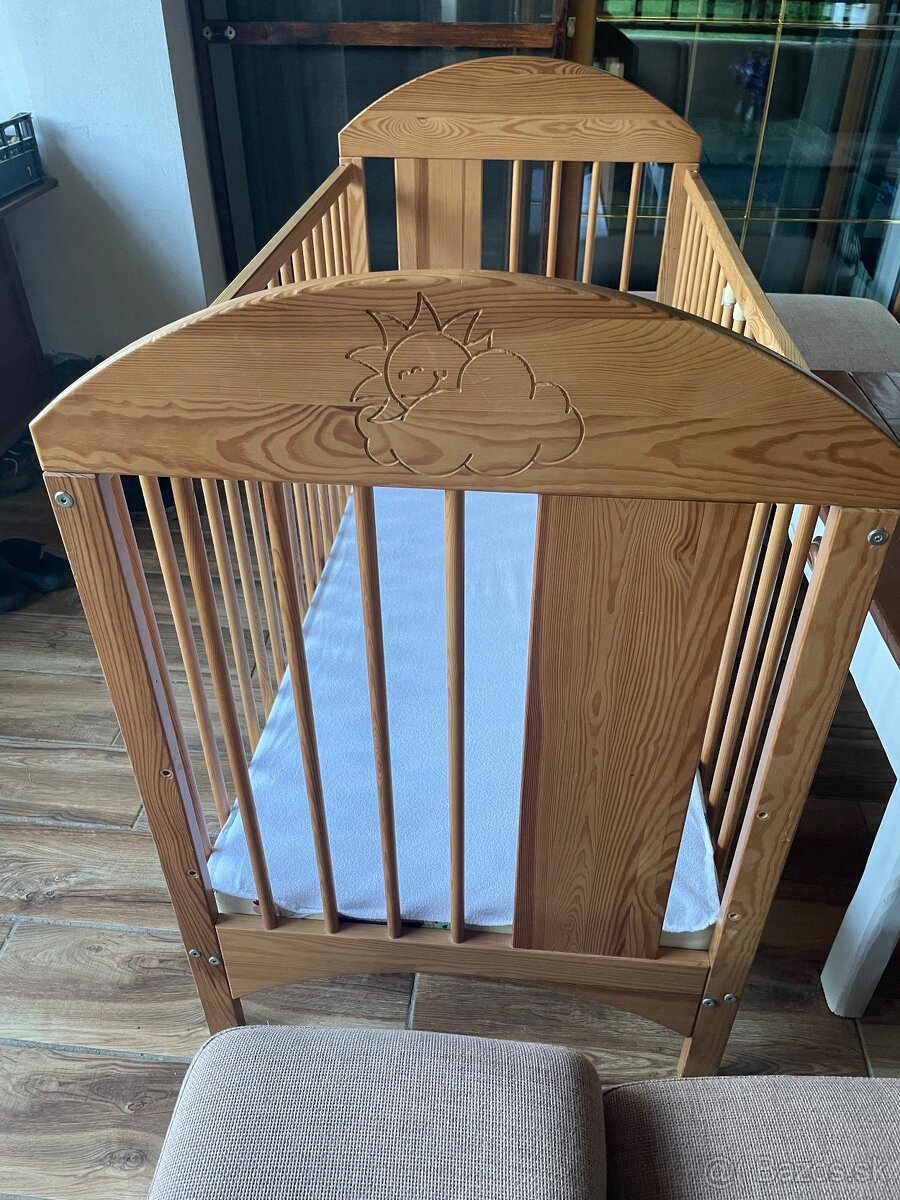 Ponúkam detskú drevenú polohovateľnú postieľku. Má pár škrabančekov, ale inak vo veľmi dobrom stave. Na čelách je pekný vyrezaný obrázok. Predávam iba samostatnú postieľku bez matraca, ten už bol zničený. V prípade záujmu môžem ponúknuť mantinel- žltý + mackovia.