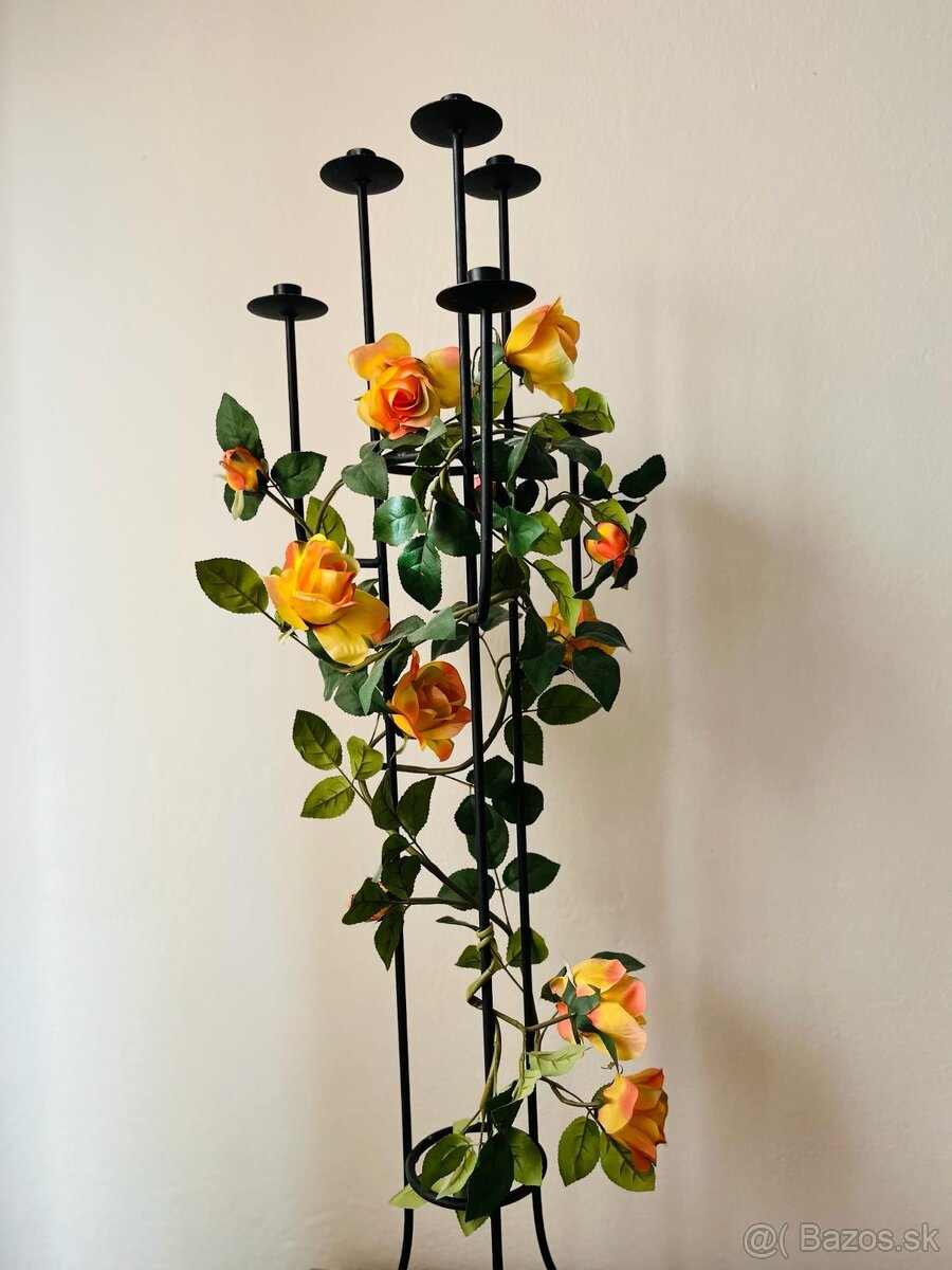Predám čierny kovový svietnik 5-ramenný, výška 106cm, šírka 30cm. Cena je spolu s odnímateľnou dekoráciou (umelé ruže).