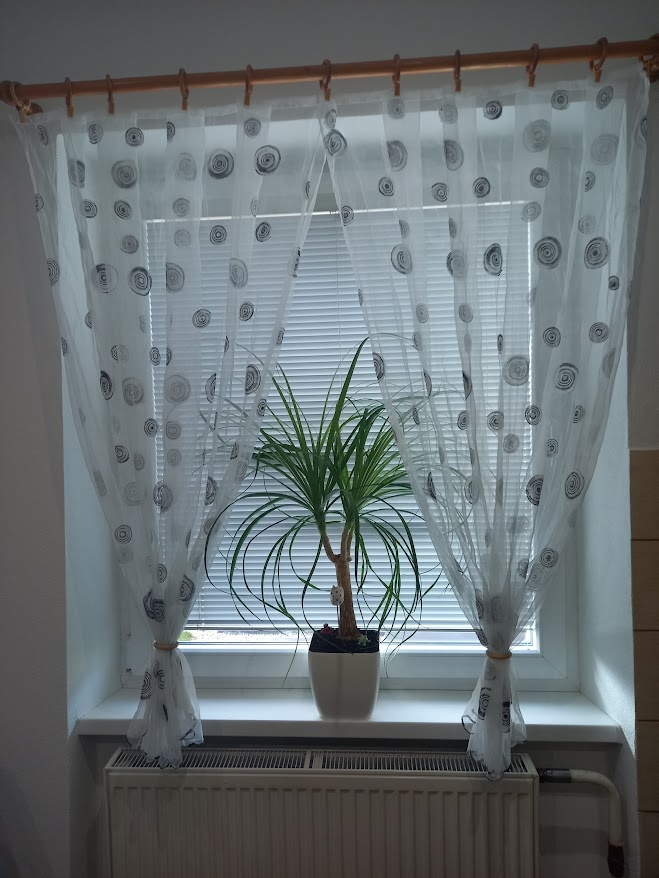 Záclony 2 kusy. Výška jednej záclony je 145 cm, šírka 155 cm. Drevenými krúžkami sa dajú rôzne stiahnuť. Cena 16 € za obidve. Na SMS nereagujem, treba volať alebo napísať e-mail.