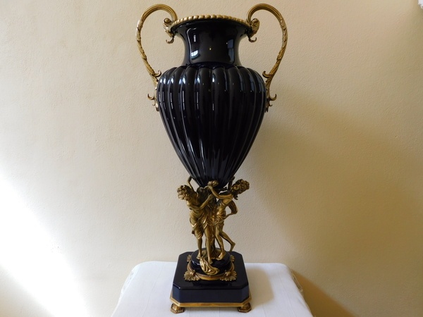 Velká porcelánová váza (kobaltová modř) s mosaznou figurální montáží, výška 78 cm, váha 12,5 kg, značeno.