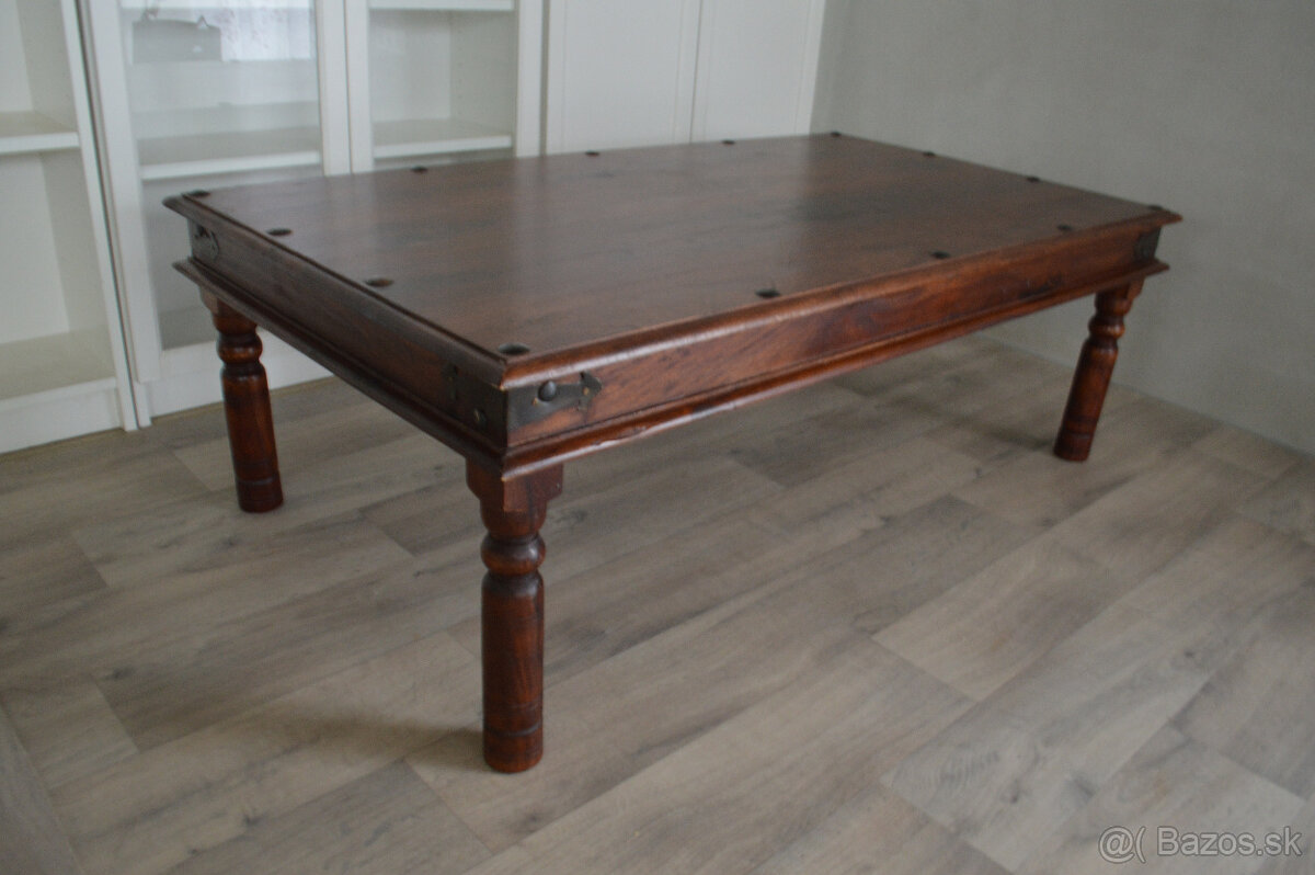 Drevený konferenčný stôl vyrobený z indického masívu-palisander. Vyznačuje sa robustnou konštrukciou a dekoratívnymi kovovými prvkami, ako sú rohovky a nity. Príznačný je koloniálny štýl inšpirovaný indickým nábytkom. Výborný stav, skvelá kvalita. Rozmery /ŠxDxV/ 75x135x45 cm. Cena 160 eur. Možnosť dopravy Senica a okolie.