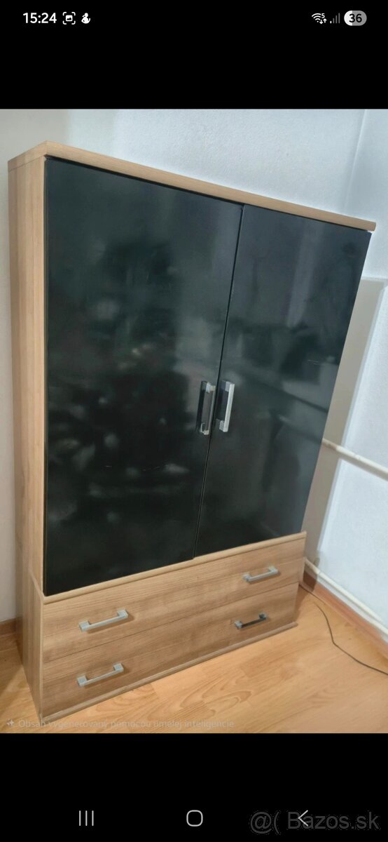 Obývacia TV stena + šatníková skriňa - [4.1. 2026]Dobrý deň, ponúkam tv stenu a šatníkovú skriňu, rozmery na fotke. Nábytok je možné zakúpiť aj zvlášť.Skriňa/70eur a stena/50 eur. Dekor je korpus biely mat a čierny lesk. Nábytok ideálny do študentskej izby.Tv stena je už v demonte, skriňa nie.Po dohode vieme priniesť na trase NZ-KN