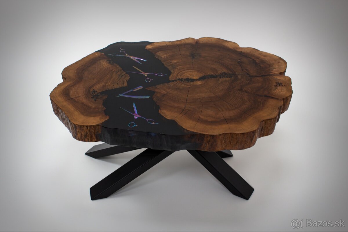 Konferenčný stôl vyrobený z dreviny brest horský v spojení s epoxidovou živicou a zaliatými barbierskými nožnicami.