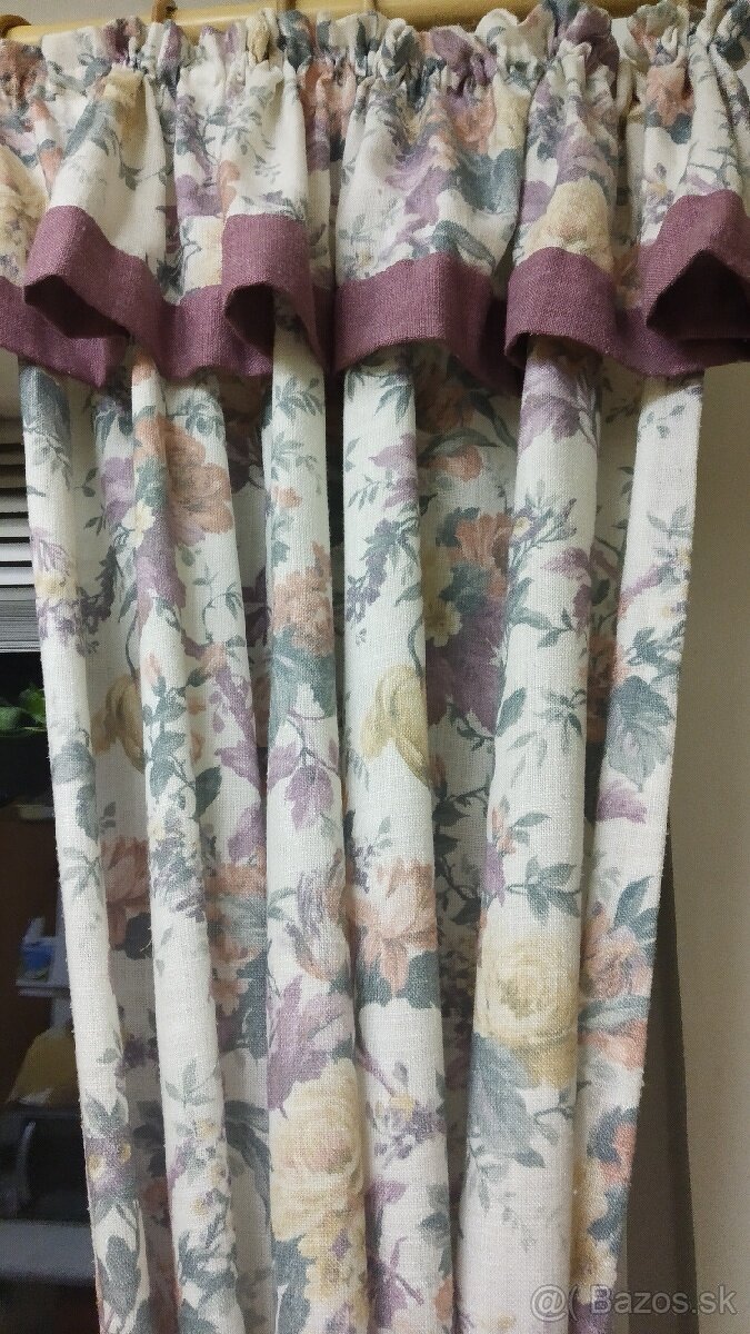 Ľanové naturálne závesy v krásnej farebnej kombinácii kvetov, krásne riasenie, výborný stav,