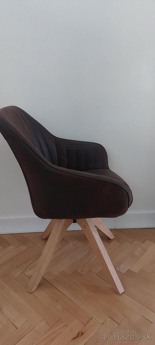 Predám používané otočné kreslo/stoličku hnedej farby s drevenými nohami. Poťah je imiácia hnedej brúsenej kože.