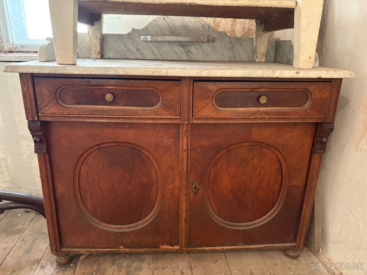 Takzvaná vodová skrinka, dýhovaná, horná doska mramorová, primerané opotrebenie časom.
