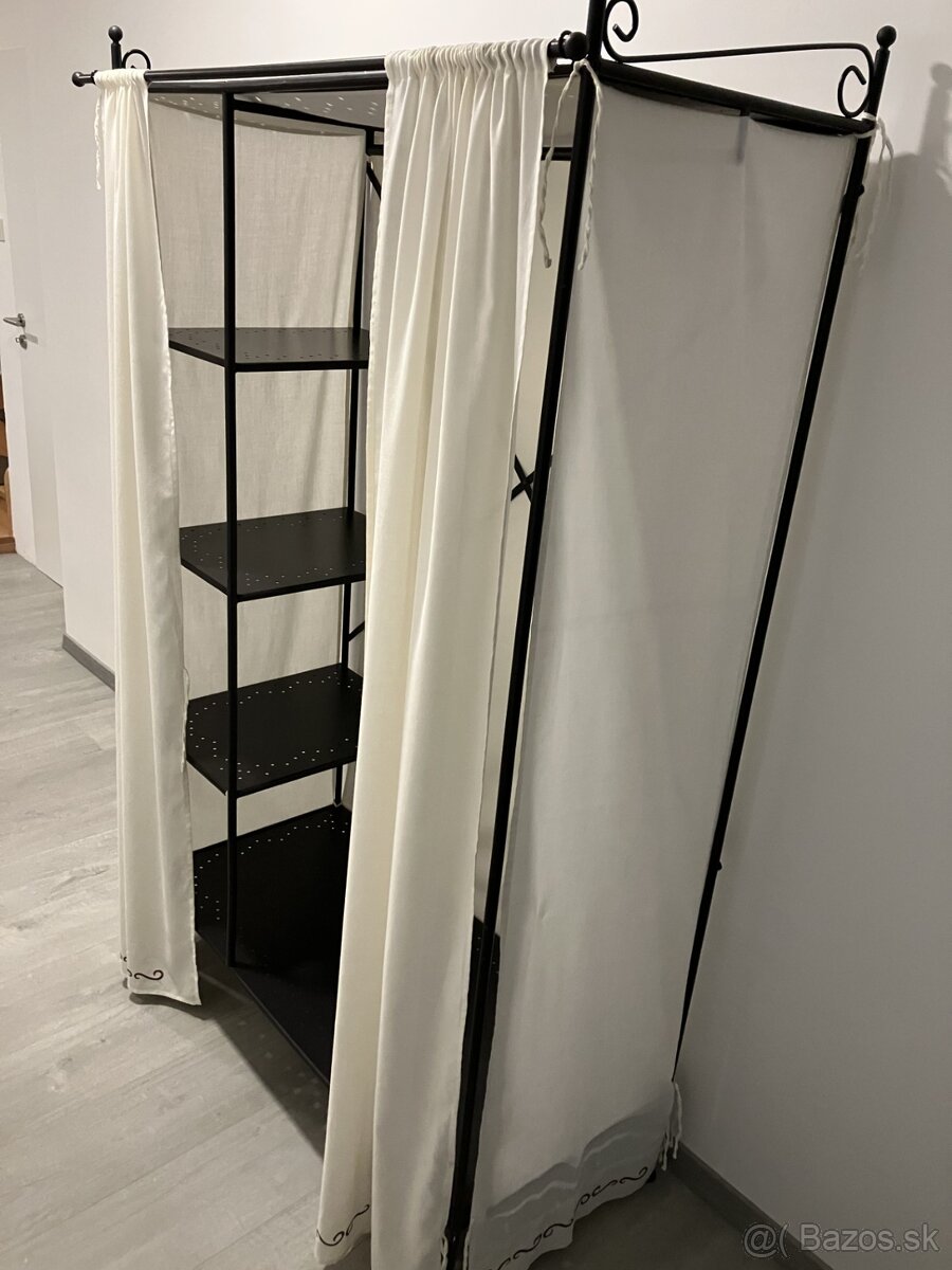 Predám čiernu kovovú šatníkovú skriňu s textilným poťahom krémovej farby. Skriňa má pevný čierny kovový rám, niekoľko praktických políc a v hornej časti tyč na zavesenie oblečenia(napr šiat, búnd, košieľ). V spodnej časti závesov je vyšívka hnedej farby. Závesy sa dá ľahko odhrnúť. Ideálna do spálne atď. Výška 190 cm, šírka 108 cm a hĺbka 50 cm. Skriňa sa dá ľahko rozobrať na prevoz. Žiaľ kvôli nedostatku miesta nebolo možné spraviť lepšie fotky. Len osobný odber.