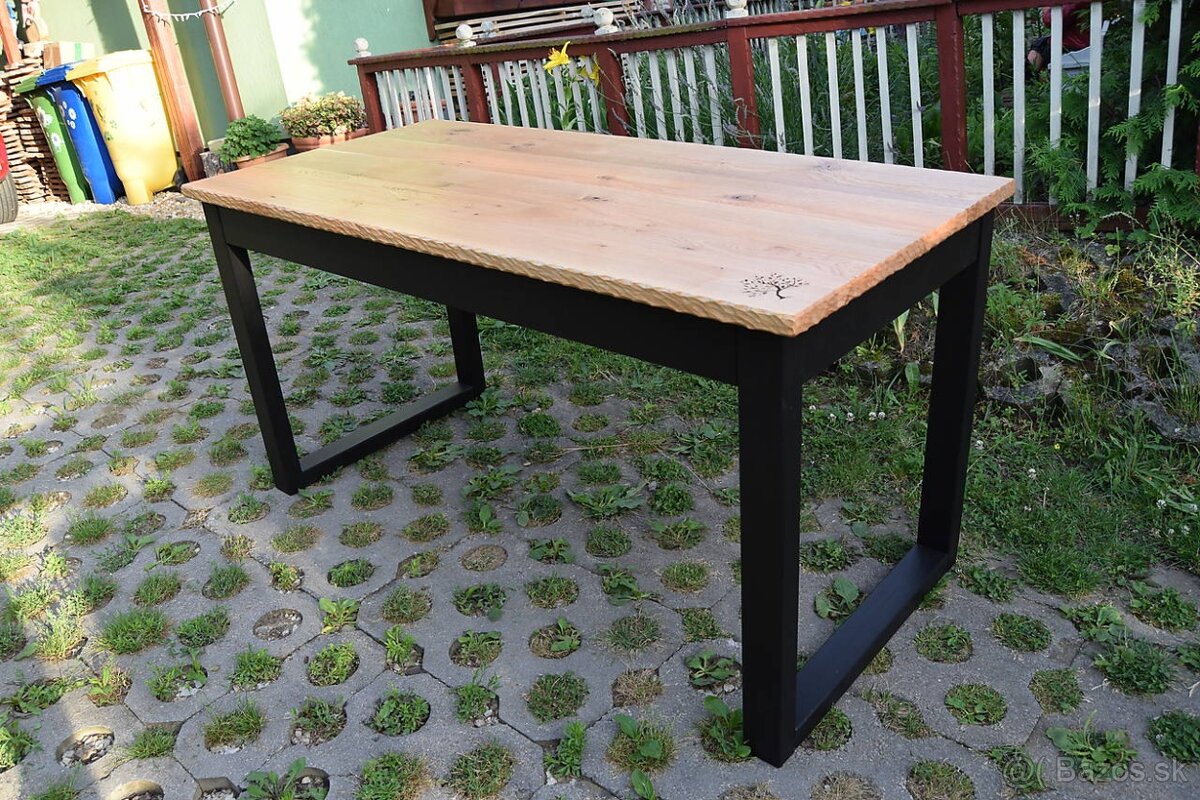 Nový originálny masívny stôl. Vyrobil som ho z tvrdého duba s pekným sfarbením a kresbou. Vrchná doska je dobre vybrúsená, hrany som upravil rustikálne dlátom a prebrúsil. Stôl som dozdobil jemnou rezbou stromu. Samozrejme Vám viem ponechať hrany hladké, len zaoblené.