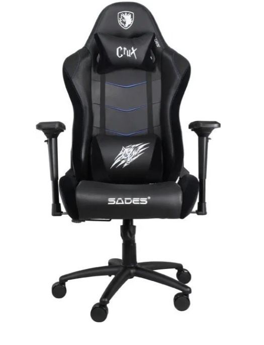 Herná stolička – materiály poťahu: syntetická koža a polyuretánové, asynchrónna mechanika, s aretáciou,, bedrová a hlavová opierka, výškovo nastaviteľné, s rotáciou vrchnej časti, s posunom dopredu/dozadu a s posunom doprava/doľava podrúčky, otočná a plastová konštrukcia, výplň sedadla molitan (PUR pena), hliníkový kríž, plastové kolieska, čierna farba, nosnosť 160 kg