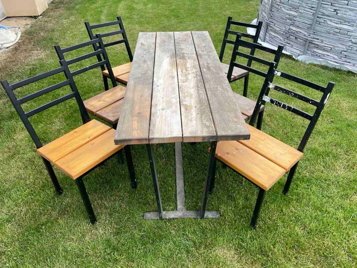 Záhradné sedenie, stôl (cca 200x90 cm) a šesť stoličiek. Je to ťažká zváraná konštrukcia, vyrábaný na mieru. Používali sme ho ako sedenie na stavbe, takže je nutné vybrúsiť a natrieť.