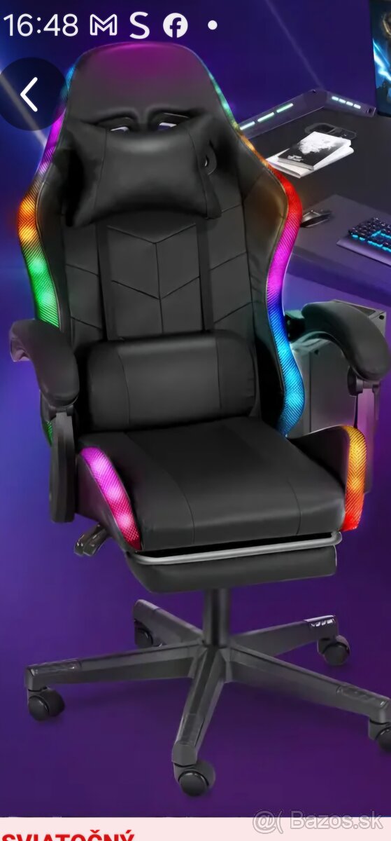 Predám úplne nové kreslo vhodne na hranie hier aj prácu na PC. Da sa polohovať, sedenie aj ležanie plus podpora na nohy. Súčasťou sú reproduktory a svetelné efekty ,ktoré si meníte pomocou diaľkovej ovládačky.Kreslo je už poskladané a vôbec nepoužívané.