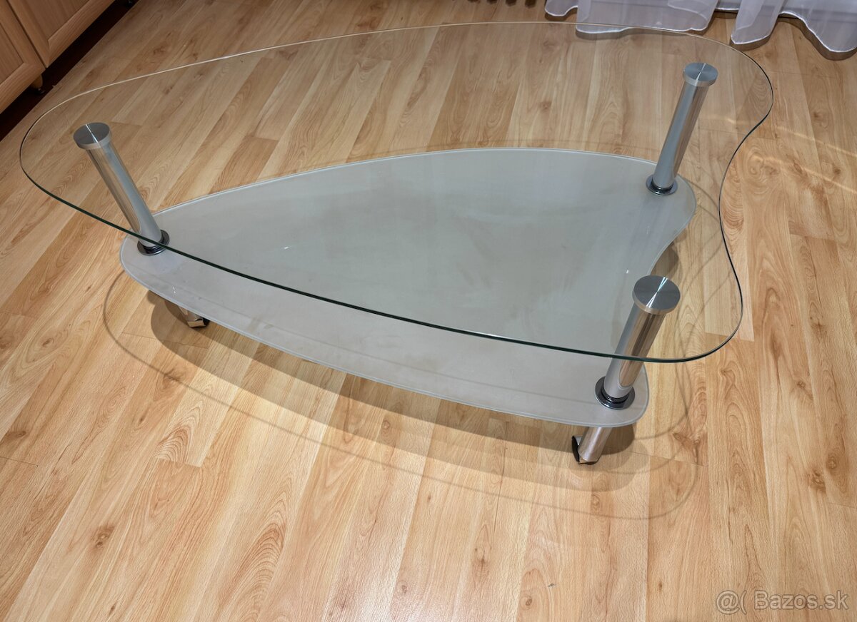 Stolík má kolieska. Vrch má škriabane a mliečne sklo je mierene flakaté. Nohy na spodu sú fľakaté.