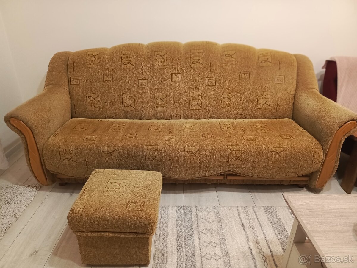 Predám sedaciu súpravu. Gauč + dva kreslá a dve taburetky s úložným priestorom. Gauč sa dá použiť aj na spanie, keď sa operadlo zloží.