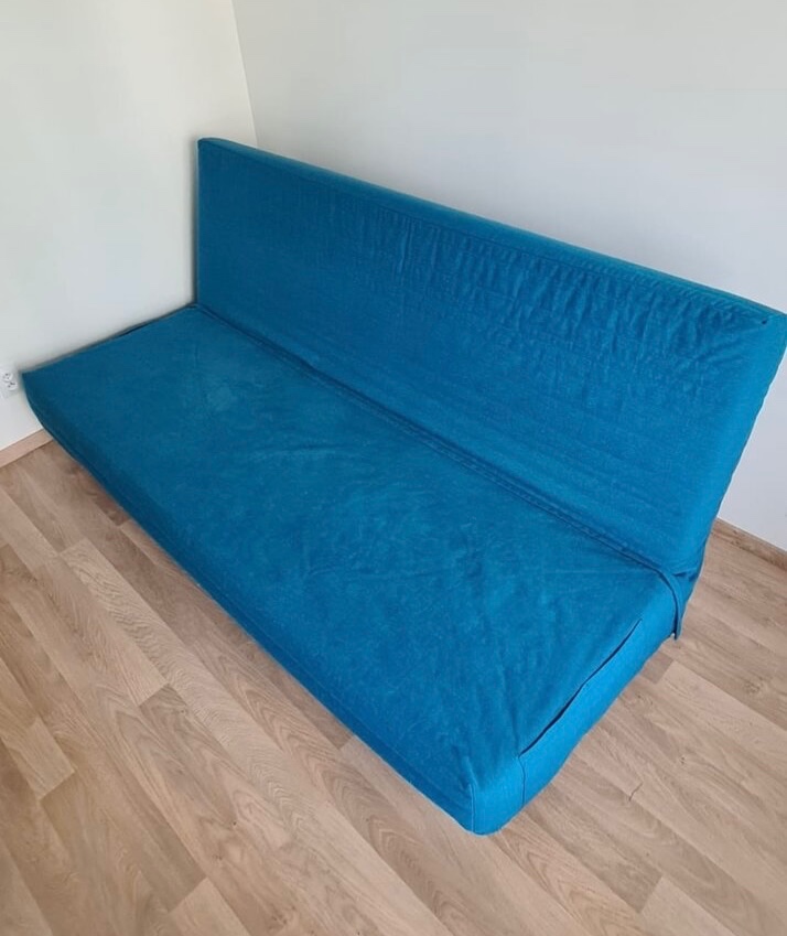 Používaná v hosťovskej izbe pár krát do roka. Farba pohovky je sivá , je na nej prateľný návlek v modrej farbe s bočnými odkladacími vreckami. Je rozložená na 2 časti.