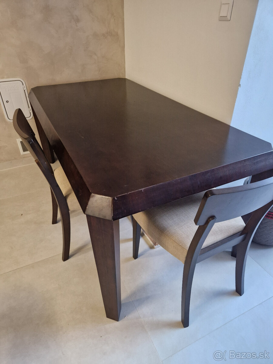 Predám masívny drevený stôl so 6 stoličkami, drobné vady na rohoch stola...viď foto, Rozmery (vrchná doska) 180 cm x 90 cm ( spolu so skosenými bokmi vrchnej dosky 190 cm x 100 cm)