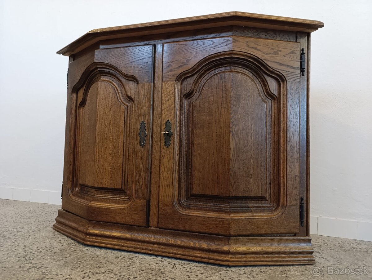 Nabízím elegantní rohovou komodu z masivu v tmavém odstínu, která zaujme svým profilováním a poctivým zpracováním.