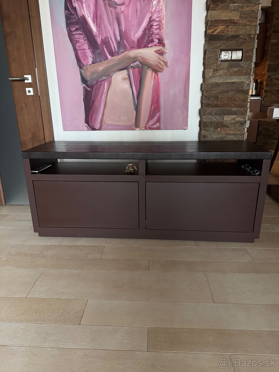 Tmavohneda skrinka pod tv s dvoma zasuvkami, vrch potiahnuty hnedou kozou.