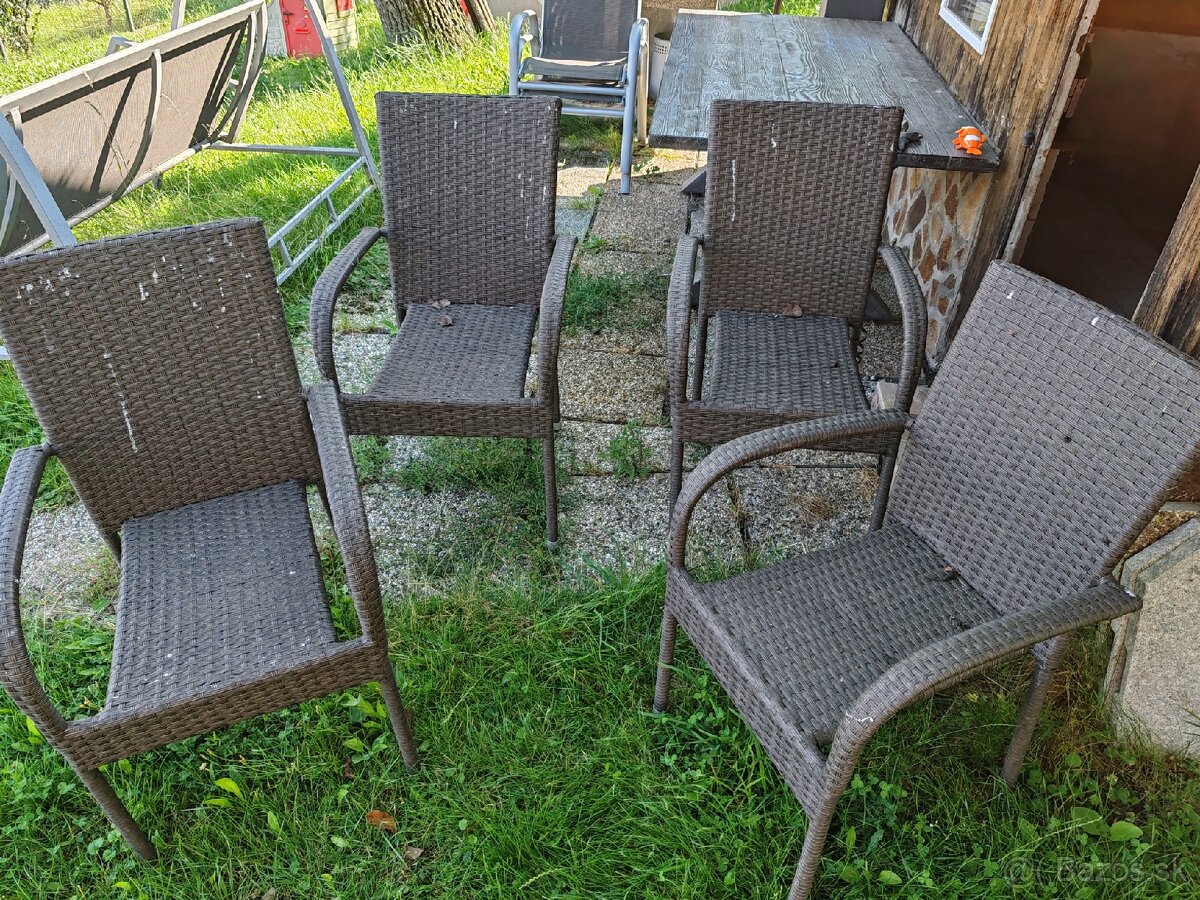Ponukam na predaj zahradne stolicky 4 kusy kovove/umely ratan na jednej stolicke sa odmotava na nohe ratan. 10 € \KS