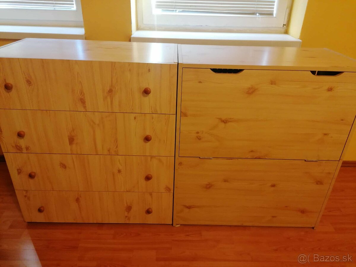 1. Komodu, materiál borovica laminát, dobrý stav, nepoškodená, šuflíky funkčné.