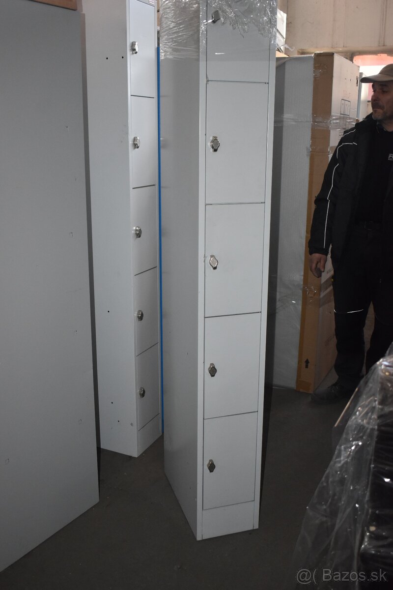 UVBOX K 1/5 - Na predaj použité 5-priehradkové skrine na úschovu cenností. Boli používané, niektoré skrine sú v perfektnom stave a niektoré obsahujú viaceré polepenia alebo malé škrabance. Tieto chyby však nijak neobmedzujú ich plné využitie. Skrine obsahujú systém na visiaci zámok, tak sa nemusíte obávať o svoje veci vo vnútri.