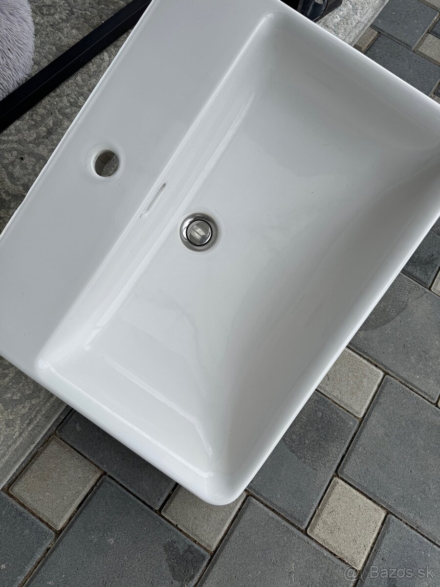 Umývadlo keramické s otvorom uprostred o šírke 60 cm, hĺbke 48 cm a výškou 11,5 cm. Mam k nemu sifon a batérie, cena ukázaná za komplet.