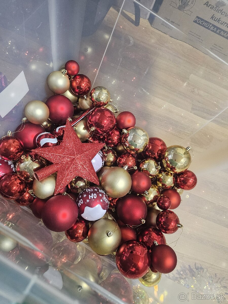Predám mix vianočných gulí, červené a zlaté, počet neviem ale je ich dosť, pridám k tomu aj hviezdu a špic, a koberček pod stromček + 4 reťaze