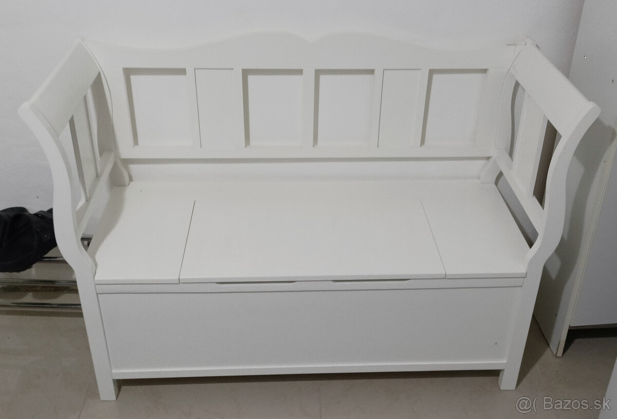 Predám praktickú drevenú lavicu spojenú s botníkom v bielej farbe, vhodnú do predsiene alebo chodby. Lavica má výklopné sedadlo s úložným priestorom na topánky či iné doplnky. Po bokoch sú pevné opierky, ktoré zvyšujú pohodlie pri obúvaní. Stabilná, vo výbornom stave, na jednom rohu lavice je prasklina, viď obrázok.