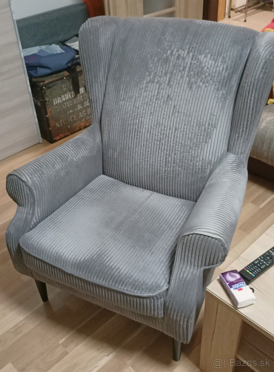 Predám málo používané kreslo ušiak VIOLA v sivej farbe. Kreslo je veľmi pohodlné, ideálne na relax, čítanie alebo k televízii. Poťah je menčestrový, príjemný na dotyk, konštrukcia je pevná a stabilná z masívneho dreva. Kreslo je plne funkčné, bez poškodenia. Farebné odtiene na poťahu sú spôsobené rôznymi náklonmi chĺpkov menčestra a dopadom svetla, nejde o fľaky ani poškodenie, ale o optický efekt (je to možné vidieť aj porovnaním prvých dvoch obrázkov). Kreslo je z nefajčiarskeho prostredia bez domácich zvierat.