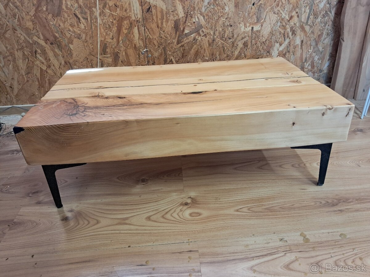 Ručne robený dreveny konferenčný stolík zo smrekového a borovicového dreva s kúskom živice.