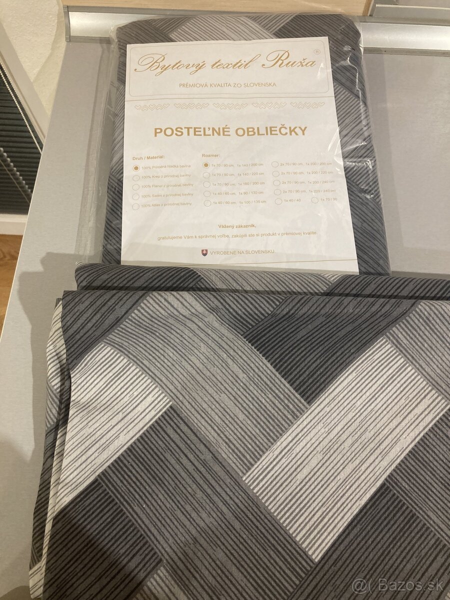 Predam len rozbalene sede obliecky z Ruzomberka. Rozmery 70x90, 140x200cm, su zo 100 percent bavlny.