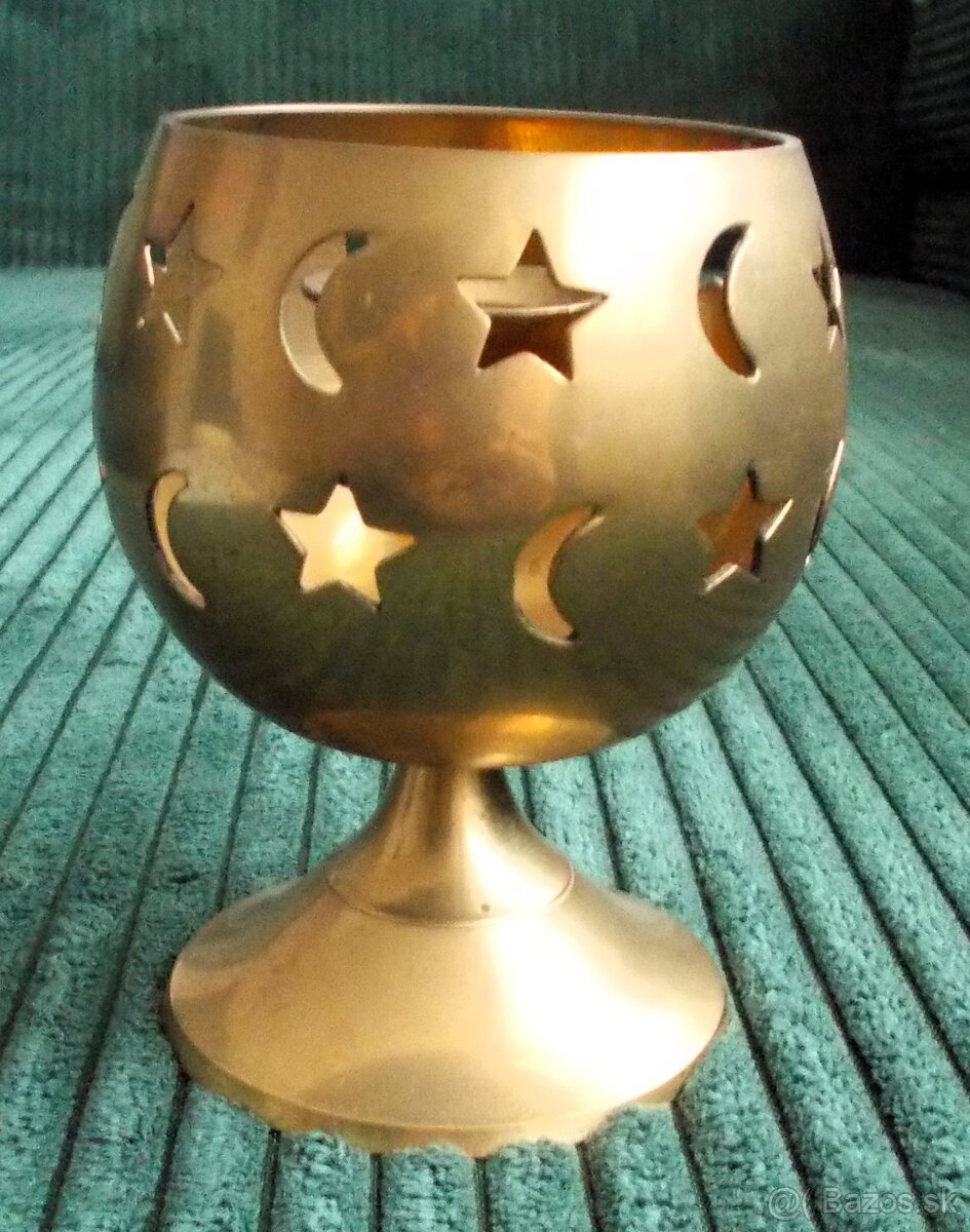 Predám kovový svietnik v tvare pohára s ozdobnými výrezmi zlatej farby, výška asi 10 cm, priemer asi 8 cm a keramickú mozaikovú olejovú lampu na čajový kahanec výšky 14cm, priemer asi 11 cm, v stave ako nové. Pošlem aj poštou, príp. na dobierku. Vhodné aj ako vianočný darček.