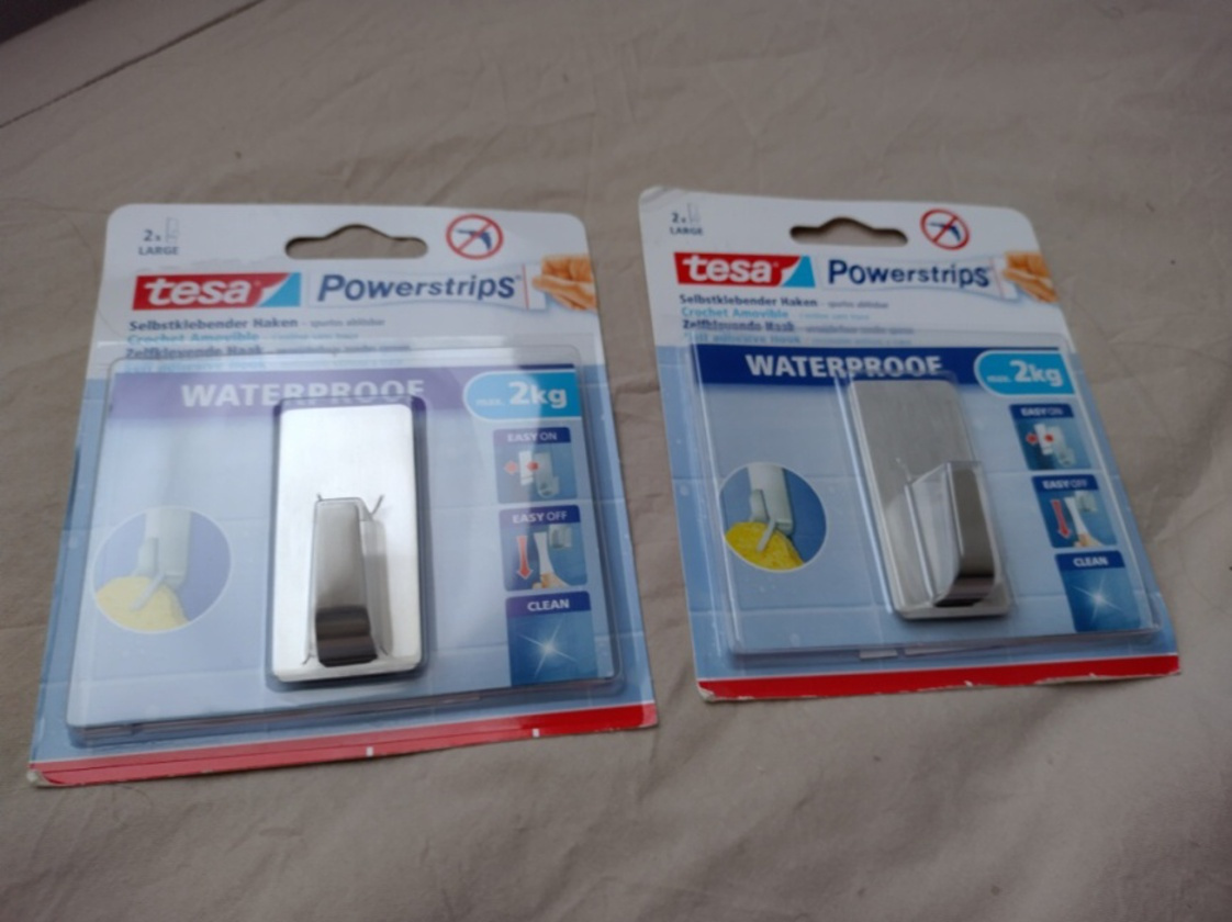 Napredaj Tesa Nie wieder bohren dva vodoodolne samolepiace háčiky Powerstrips Waterproof, nerezová oceľ, nosnost 2 kg. Nove nerozbalene.mam dva kusy, cena dole je za jeden kus.