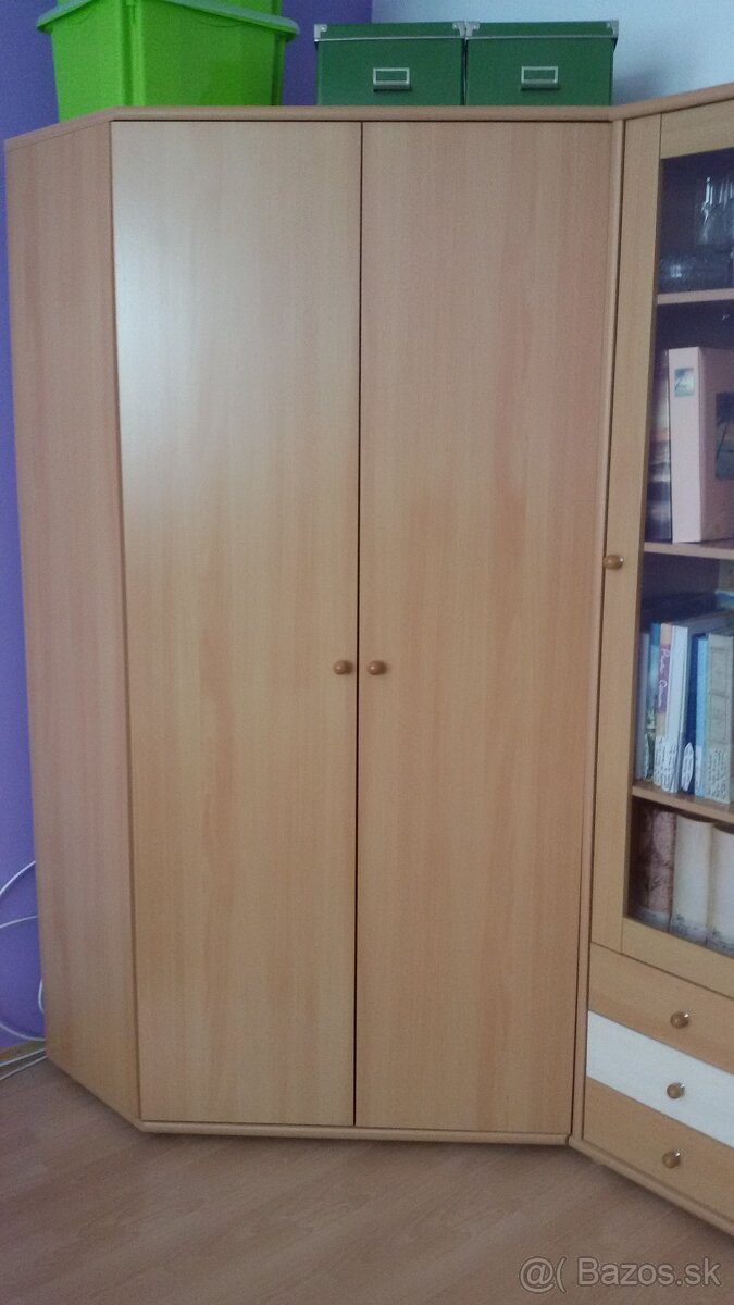 rozmery výška 197 cm, dvere 88 cm, roh pravý uhol 100x100 cm, bočné strany 40 cm. Dá sa odviezť iba v demonte. Neposielam, odber osobný. Nie je to masív, ale ťažší materiál. Je to veľká skriňa, bežná cena v obchode 430 eur, menšia s jednými dverami 308 eur. Len pre ilustráciu.