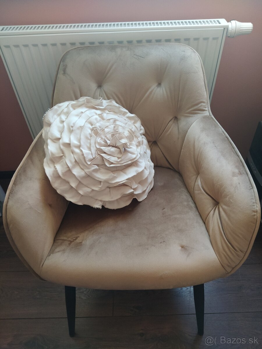 Kreslo zamat, zamatová stolička, kreslo ku kozmetickému stolíku, kreslo do spálne, luxusné kreslo, dizajnové kreslo, dizajnová stolička, stolička ku kozmetickému stolíku, luxusná stolička. Ako nové, nevysedené a bez poškodenia. Bolo používané dva roky v spálni na odkladanie vecí. Výška sedu: 48 cm; hĺbka sedu: 46 cm; šírka sedenia: 43 cm; výška chrbtovej opierky: 39 cm; nosnosť: 90 kg. S mäkkou sedacou časťou. Čierne kovové nohy. Cena je 100 EUR a je pevná (PC bola 145 EUR). Ak inzerát je zverejnený = ešte aktuálny. Len vážni záujemcovia!!! Telefónne číslo je vymyslené. Kontaktujte ma prosím prostredníctvom mailu.