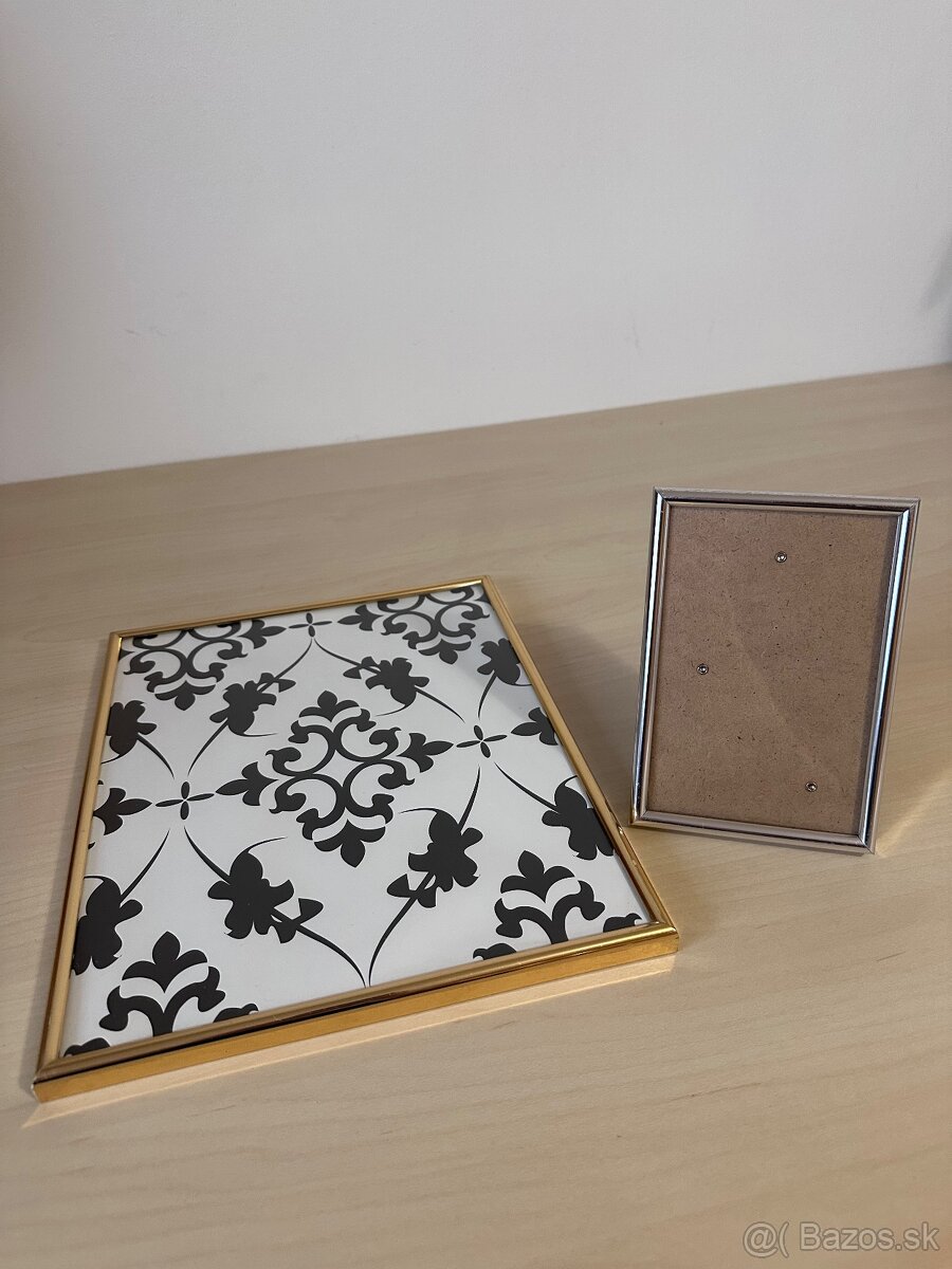 Ramy na fotky / obrazy. Mensi ma rozmery 10 x 15 cm, vacsi 24 x 30 cm. Vacsi je mozne zavesit na stenu na sirku alebo vysku, mensi ma zaklapaci stojan. Obidva ramy so sklom, neposkodene, neposkriabane, nove.