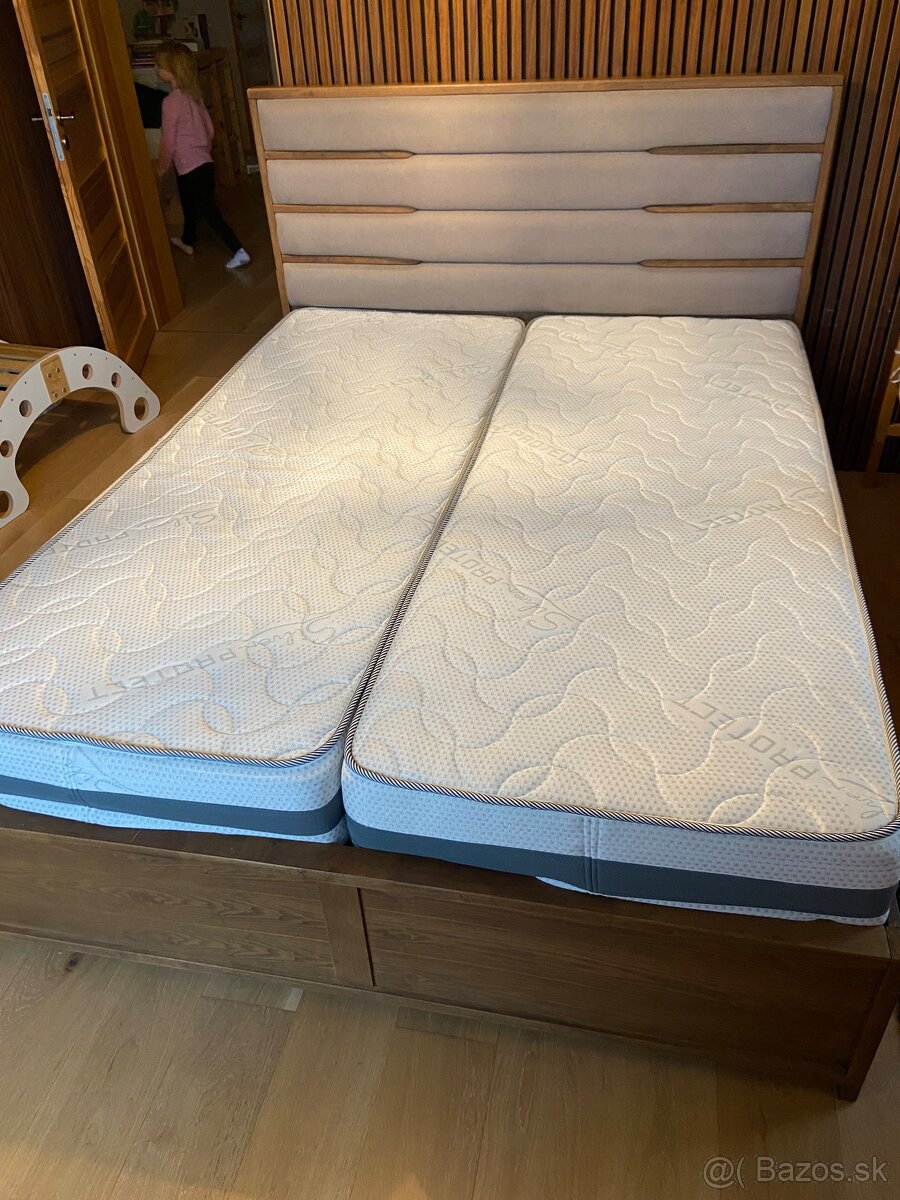 Posteľ bola používaná 4 roky , matrace Dormisan 6 rokov , posteľ bez poškodenia , meníme za väčšiu . Matrace sú tiež v poriadku . Posteľ má úložný priestor 6 šuflíkov, časť postele je masív . Farba orech . Rošt jednoduchý drevený.