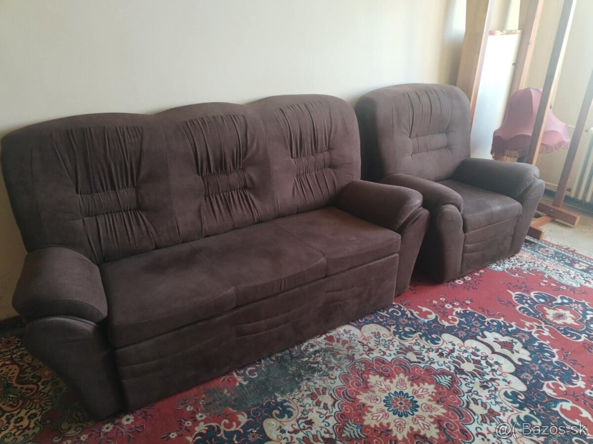 Predám Gauč vo veľmi dobrom stave, gauč je pevný a je ROZKLADACÍ na spanie, sedelo sa na ňom MINIMÁLNE. Spolu s dvomi kreslami. Gauč má šírku 1,9m a 1 kreslo cca 1m.