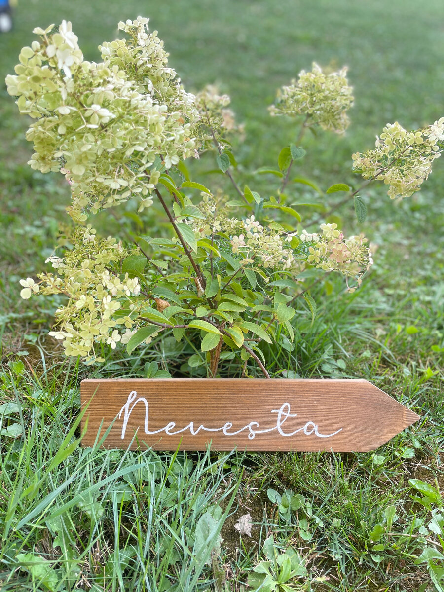Drevená šípka Nevesta je ručne maľovaná hnedou lazúrou a bielou akrylovou farbou, slúži ako dekorácia na svadbu, aby ukázala hosťom ten správny smer, kde nájdu nevestu :-)