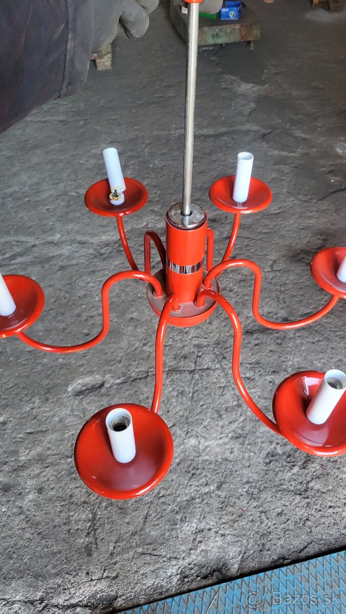 Šesťramenný kovový luster v červenej farbe, ktorý má evokovať dobové lustre so sviečkami.
