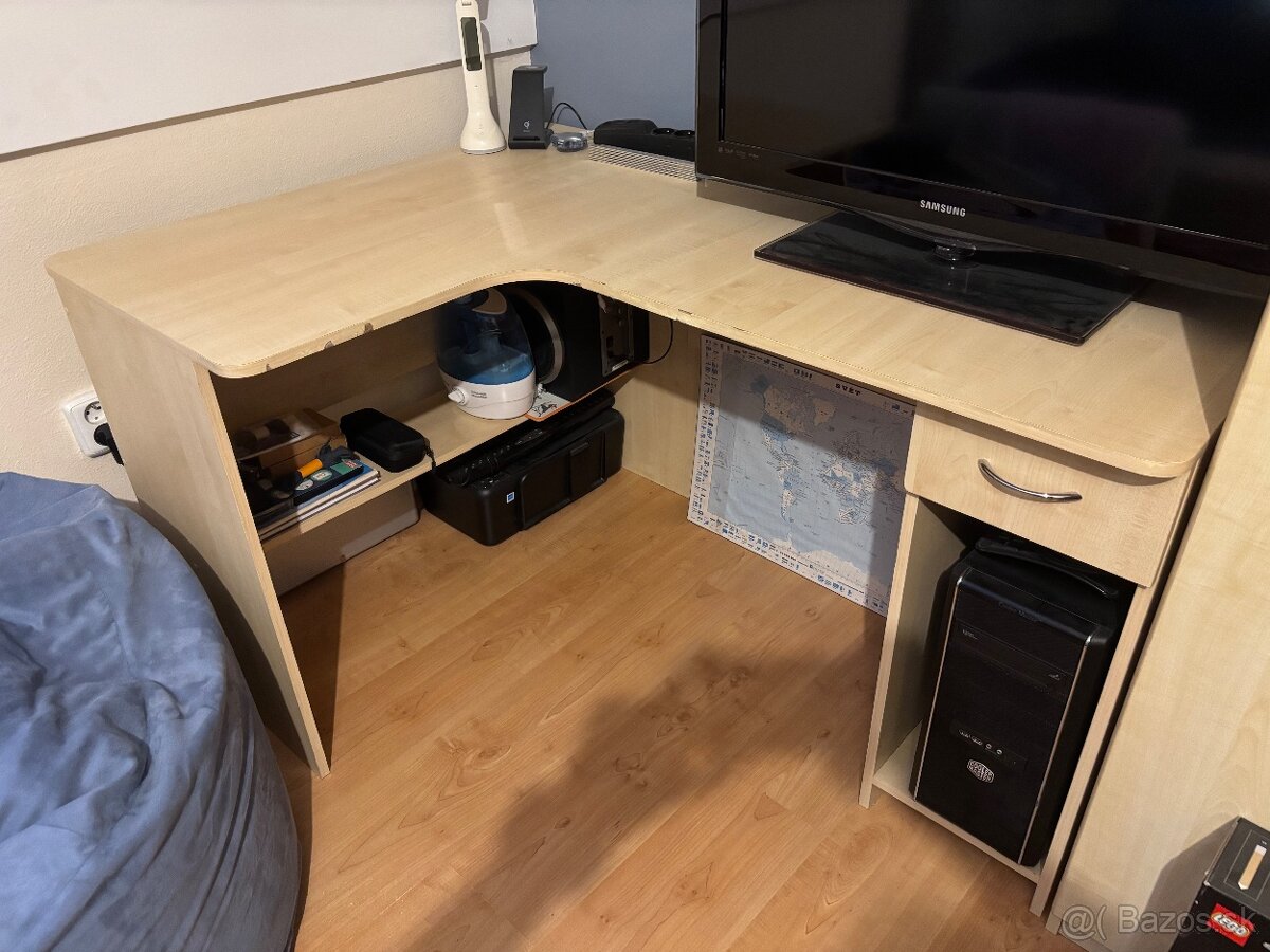 Predám pracovný stôl v tvare L rozmerov 140x100x76 výška. Hĺbka pracovnej plochy 55cm. Stôl je v dobrom stave so známkami používania víz. foto. Farba: Javor.