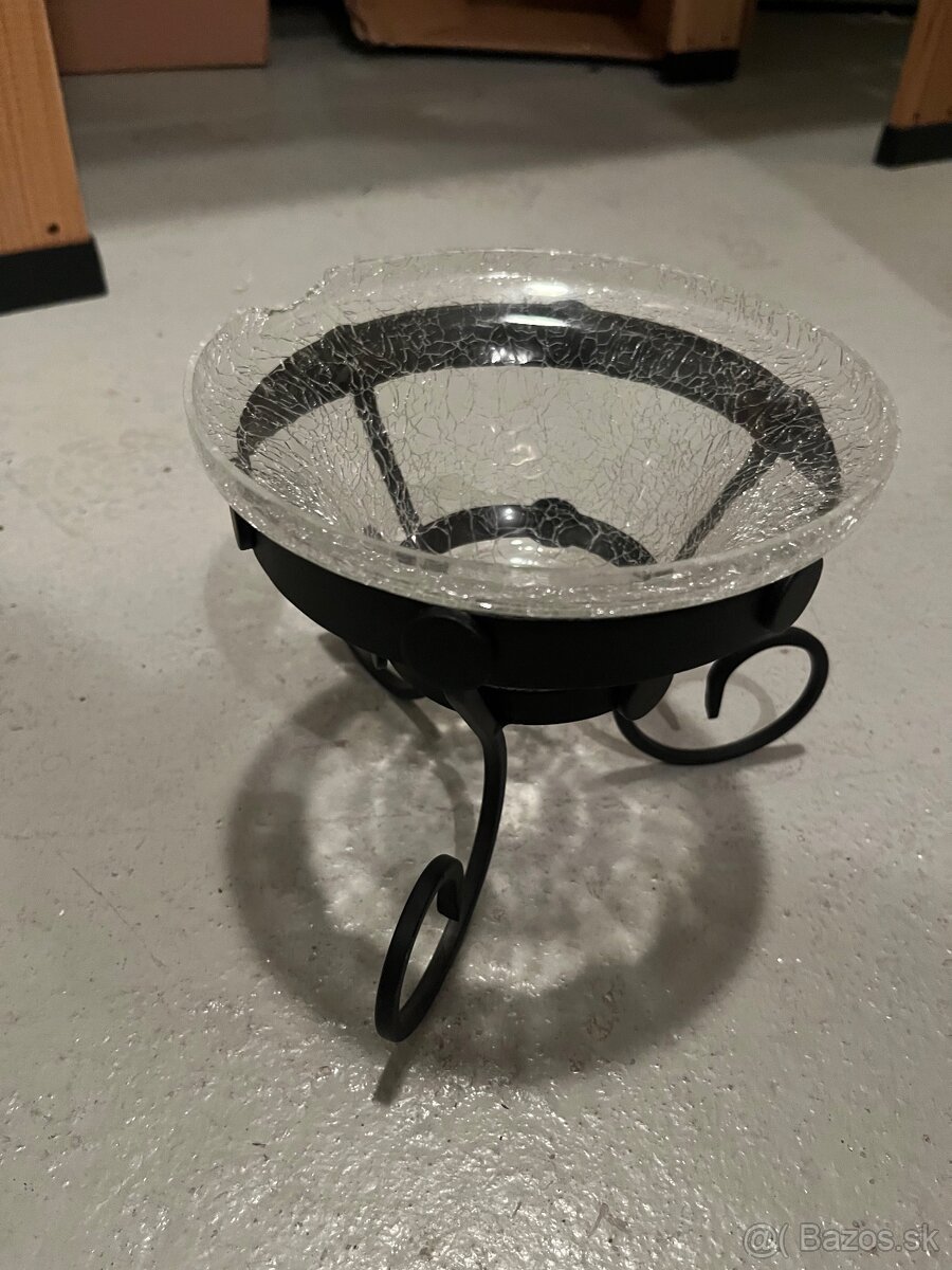 Predam dekoračnú misu, napriklad na chatu, skladá sa z kovového stojanu a sklenej misy (volne vlozena), misa ma jemne nastiepeny okraj na jednom mieste, ma efekt akoby popraskaneho skla. Symbolicka cena. BA - Ruzinov.